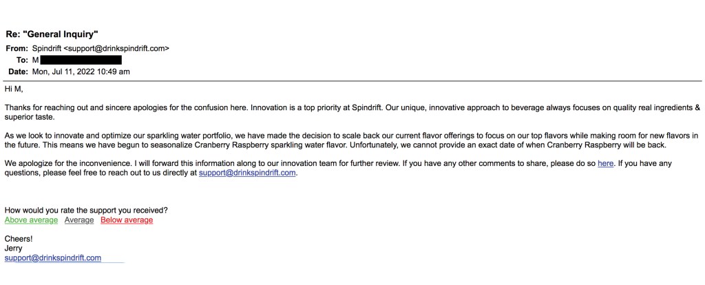 (I know this update interrupts the flow of this essay, but as a September update, Spindrift reached back out to me this week to let me know Cranberry-Raspberry is back!)